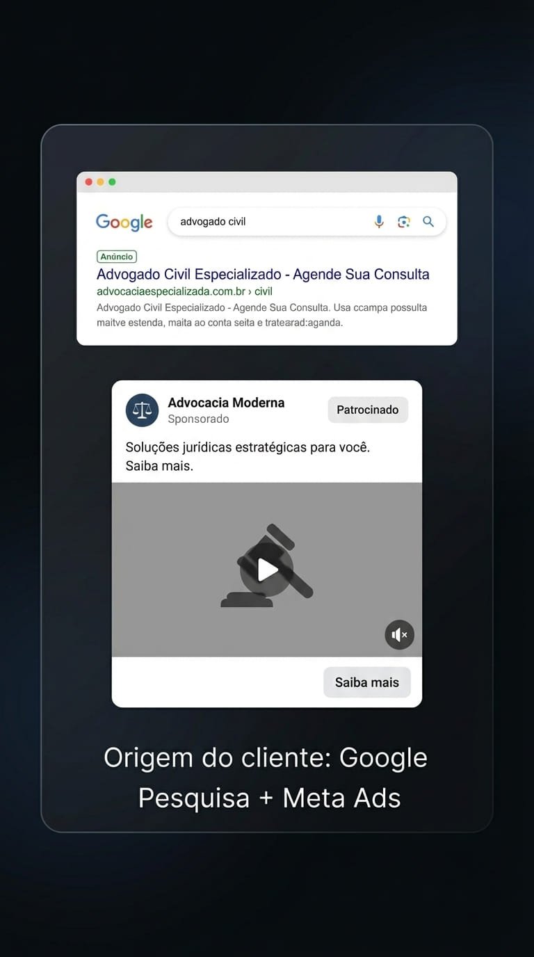 Estrutura ativa com Google e Meta Ads configurada com IA. Você sabe exatamente de onde o cliente vem.